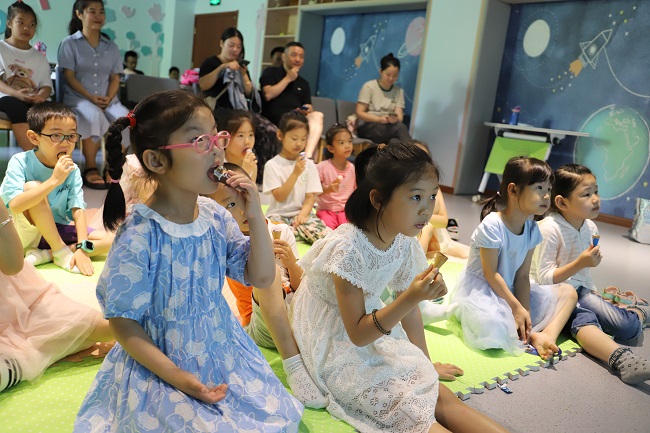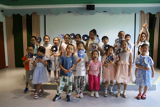 绘本故事中,炎热的夏夜,月亮热化了,楼主奶奶用化了的月亮做成冰激凌分给居民,顿时凉爽了许多。活动现场,馆员妈妈也给孩子们准备了冰激凌,大家一边品尝,一边倾听,跟随故事认识了节能环保的重要性。随后,馆员妈妈引导孩子们观察月亮的变化,并将月相图粘贴在定制的扇子上,完成这一特别的任务,孩子们回到家后,还可以继续发挥自己的想象力,把抽象的知识变得具体化。