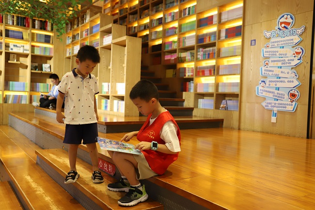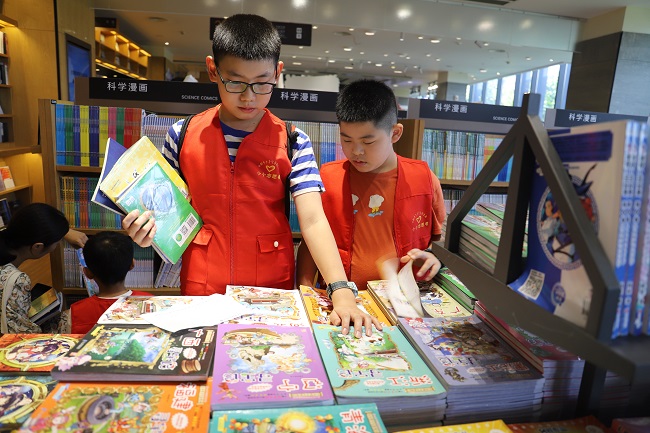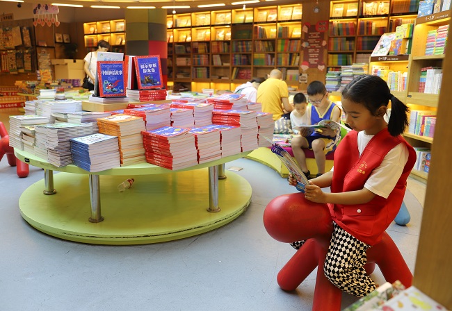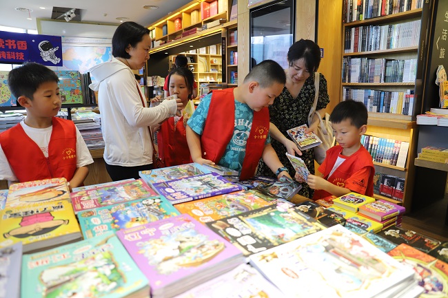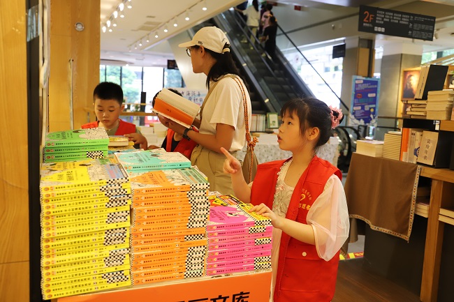 鳞次栉比的书店里,一抹醒目的“红”移动于一排排书架之间,小读者们三五成群,有的在和父母商讨,有的则自己在认真翻阅……4岁的曹舒冉是本次活动的最小“采购员”,只见她开心地在绘本区跑来跑去,看到喜欢的图书便停下脚步,忙碌的小身影让人忍俊不禁,曹舒冉的妈妈说:“她和她哥哥都在图书馆办理了借阅证,今天是她第一次参加新书‘采购’活动,看到这里琳琅满目的图书,高兴坏了,说以后还要再来。”
